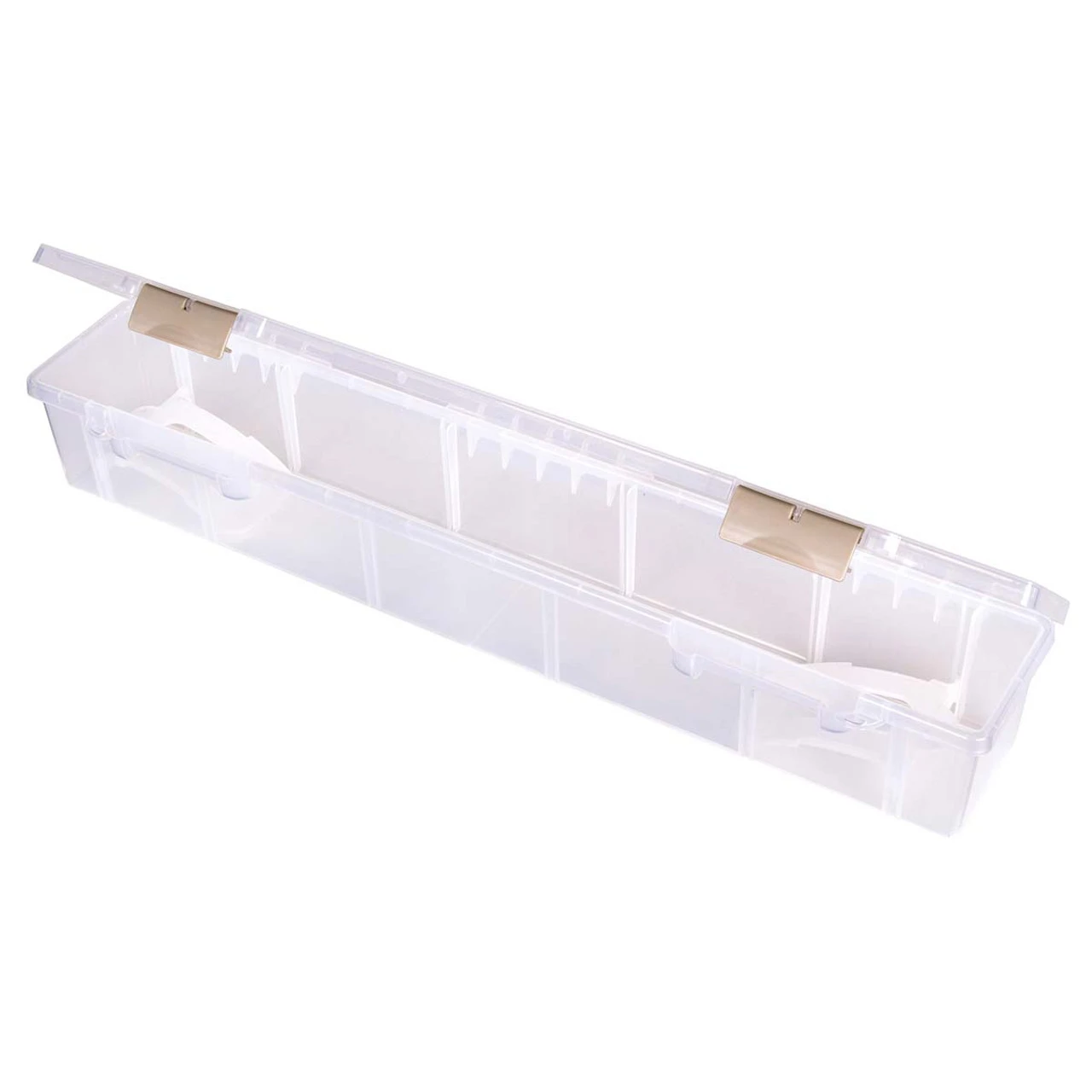 Reduce wrinkles by storing fabric strips flat! This clear plastic case is specially designed for storing 2½ × 48″ (6.4 x 122cm) fabric strips with minimal folding, saving you time as strips will require less ironing and pressing before sewing. Adjustable pressure clips hold the strips in place and a hinged lid keeps it secure during travel or storage. 24 × 5 × 3½” (61 x 12.7 x 8.9cm).