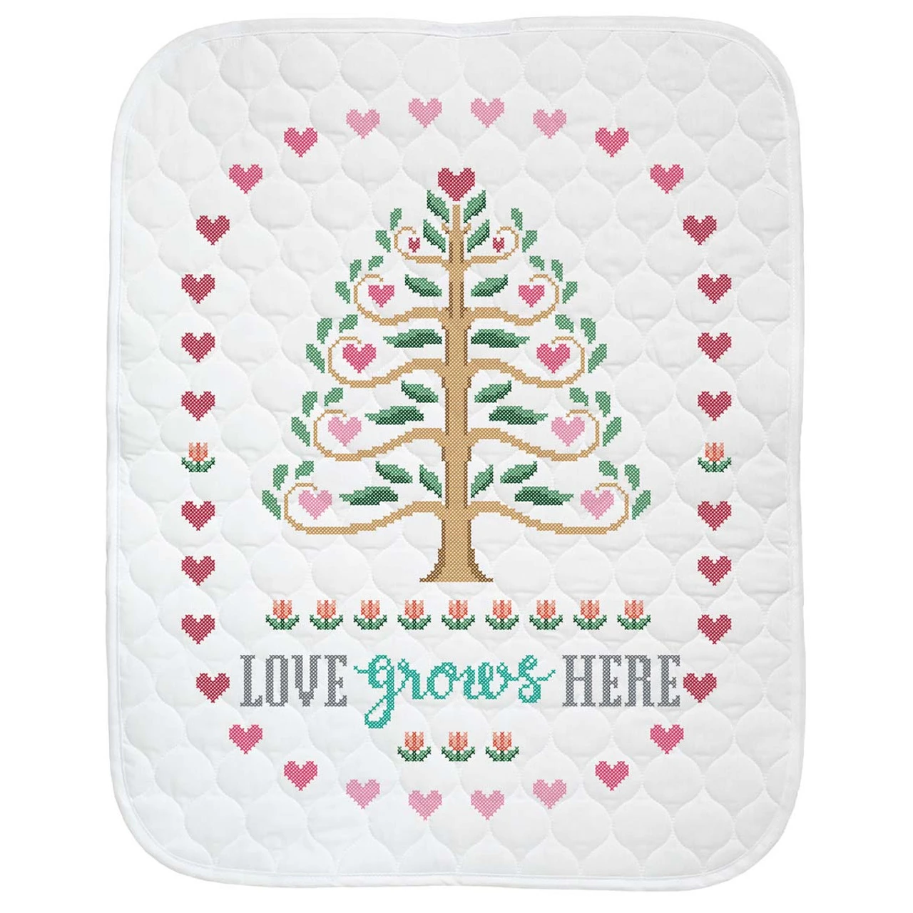• This cross-stitch baby quilt is ready for stitching with the phrase “Love grows here” under a tree embellished with leaves and hearts with tulips growing along the ground and a frame of pink hearts.