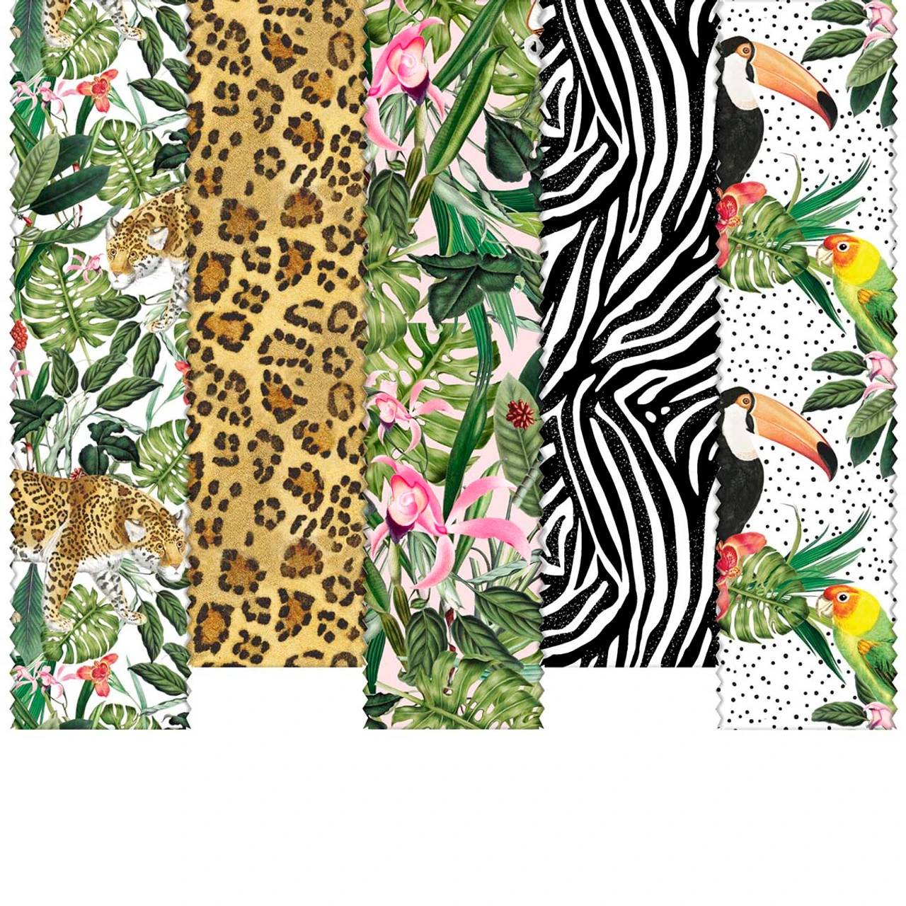 • Fabric prints feature zebra print, leopard print, tropical botanicals, and parrots.