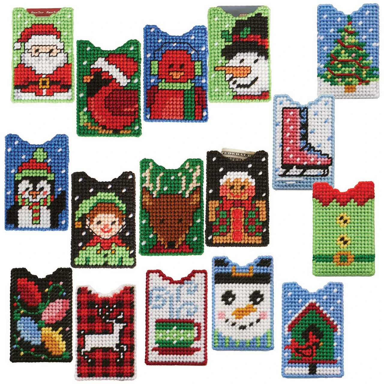 • Christmas plastic canvas designs feature a birdhouse, a reindeer, a snowman, an elf suit, Christmas lights, an ice skate, a Christmas tree, a mug of cocoa Santa, an elf, a reindeer, a penguin in a winter hat and scarf, a cardinal in a Santa hat, a red bird in earmuffs and a scarf, a gingerbread man in a festive vest and bow tie, and a snowman wearing a top hat.