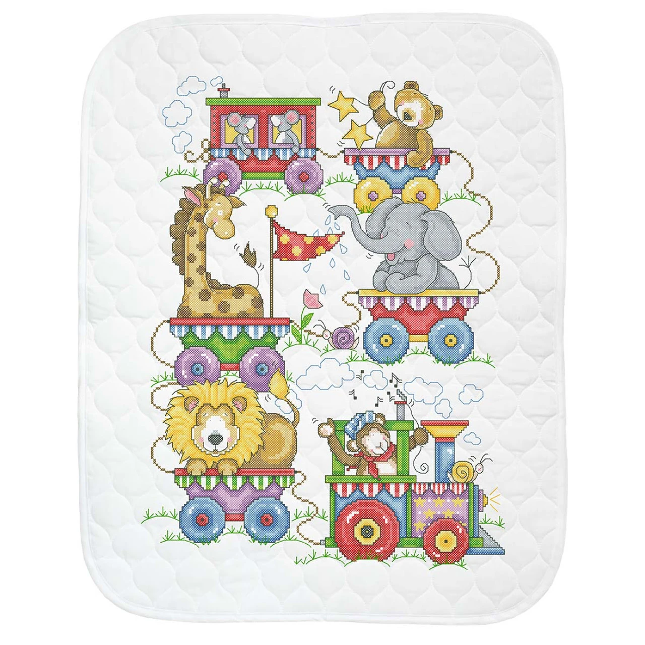 All aboard for a fun-filled baby nursery with this lively troop of circus animals. Stamped for cross-stitch on pre-quilted white polyester/cotton fabric with a bound edge. Kit includes cotton floss and needle. 34 x 43″ (86 x 109cm). Made in U.S.A. and imported.