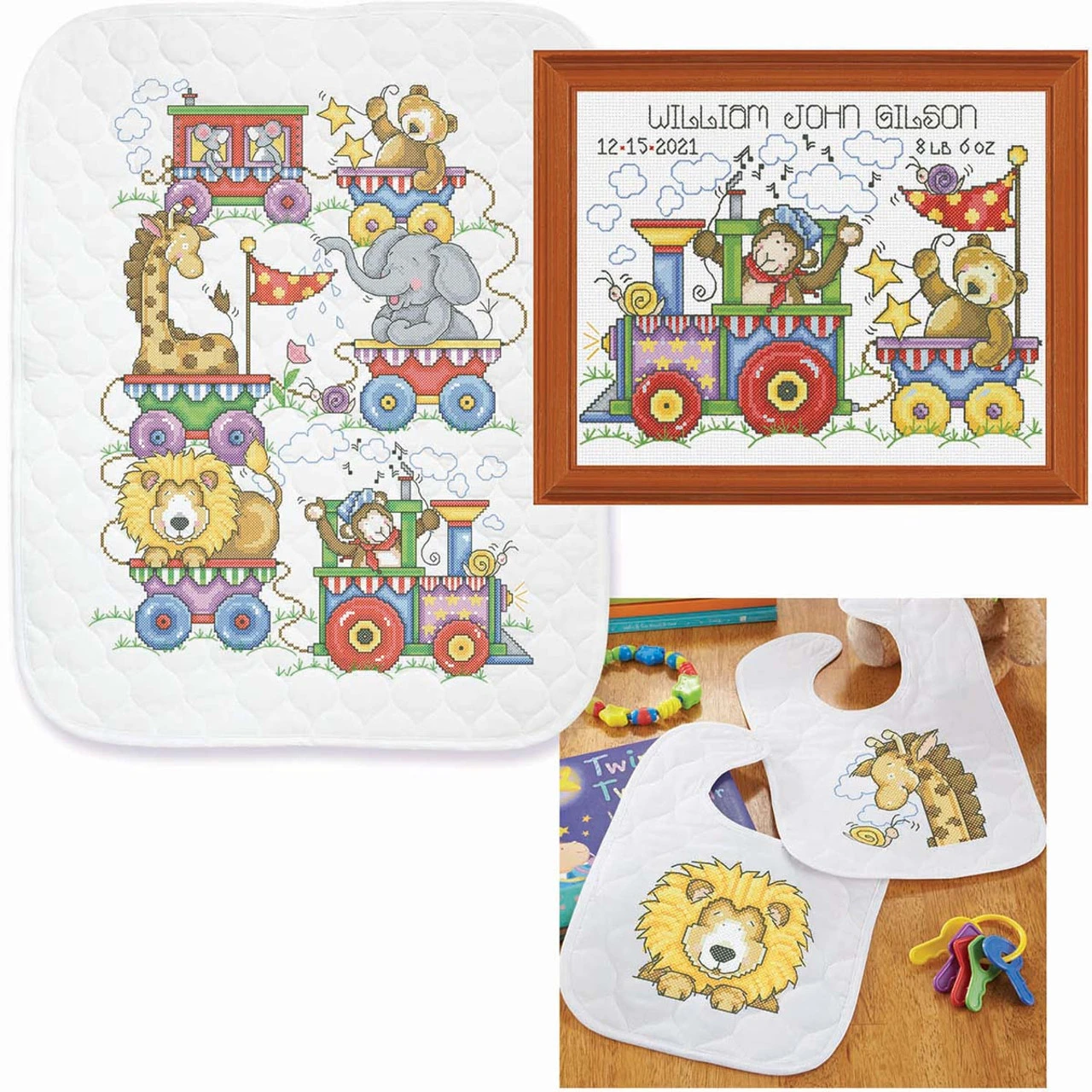 All aboard for a fun-filled baby nursery with this lively troop of circus animals! This colorful circus train features a monkey, lion, giraffe, elephant, bear, and mice with playful patterns and imagery to delight baby and parents. This bundled set helps you create a coordinated nursery with a matching baby quilt, pair of baby bibs, and a birth record. The baby quilt and bibs are stamped for cross-stitch on pre-quilted white polyester/cotton fabric with a bound edge. The bibs have a hook and loop closure. As both are pre-finished and pre-quilted, there are no extra sewing or quilting skills needed. The counted cross-stitch birth record kit includes 14-ct. white aida cloth. All kits include cotton floss, floss organizer, and needle. Made in U.S.A. and imported.