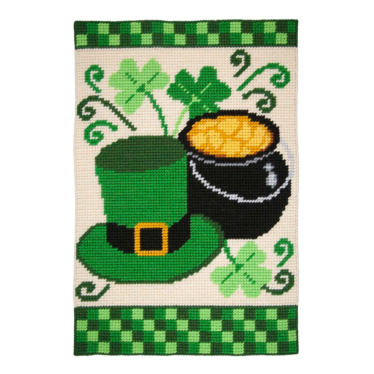 This playful plastic canvas wall hanging features classic St. Patrick’s Day colors and motifs as a perfect way to show off your love of the Irish. The delightful design features a large leprechaun hat next to a pot of gold, surrounded by shamrocks and a green geometric border. This wall hanging is stitched on 7-mesh plastic canvas. The kit includes plastic canvas, acrylic yarn, needle, and complete instructions. The finished wall hanging measures 12 x 18″ (30 x 46cm). Imported.