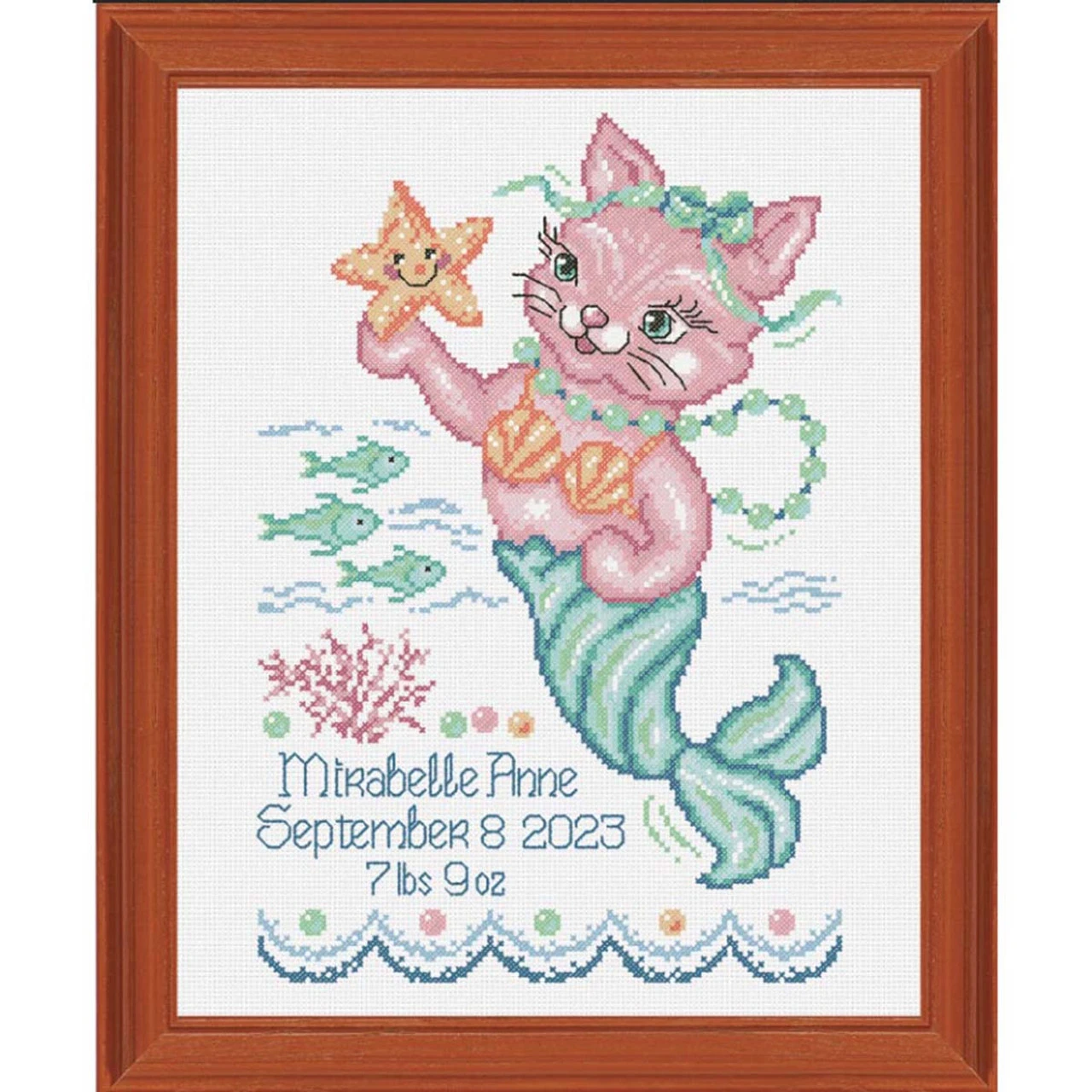 Celebrate baby’s arrival with a personalized cross-stitch birth record. This counted cross-stitch birth record kit features a pink kitten with a mermaid tail making friends with a smiling starfish as a school of fish swim through the ocean around an open area to stitch baby’s name, birthday, and birth weight. This one-of-a-kind nursery décor will become a precious keepsake as baby grows. This design is stitched on white 14-ct. aida cloth. The easy-to-see squares of aida cloth make it a great fabric choice for both beginning stitchers and those with more experience. This complete counted cross-stitch kit includes white 14-ct. aida cloth, cotton floss, floss organizer, needle, and instructions with personalization directions. Frame not included. The finished design measures 8 x 12″ (20.3 x 30cm). Imported.