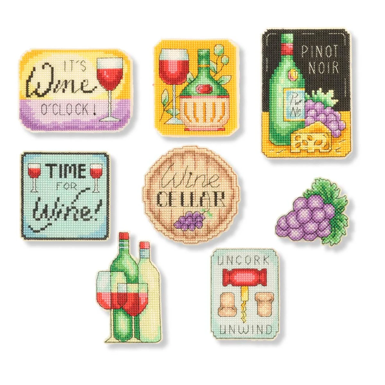 Cute and clever designs bring a taste of the vineyard to your kitchen. Counted cross-stitch kit includes 14-ct. plastic canvas, cotton floss, floss organizer, magnets, and needle. 4 × 2½” (10.2 x 6.4cm). Set of eight. Imported.