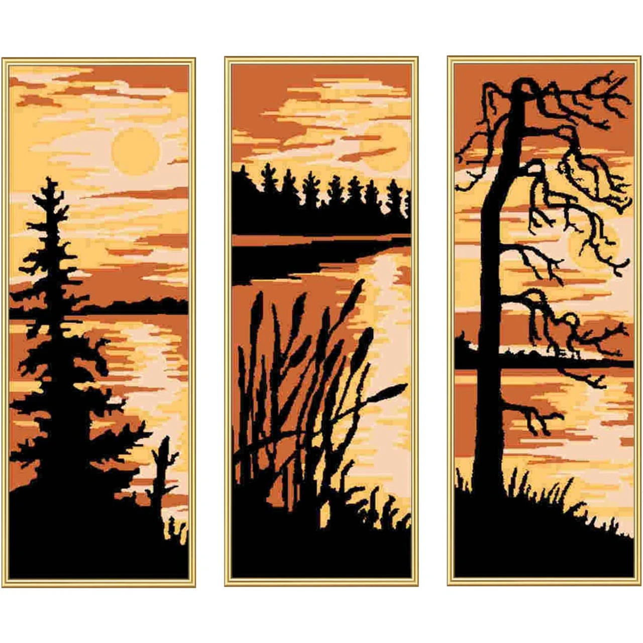 Take in a truly spectacular sunset from three different angles with this breathtaking trio of designs. The silhouetted designs can be displayed triptych style or individually. Needlepoint kit includes 10-ct. antique canvas and suggested thread list. Each section is 6 x 16″ (15.2 x 41cm). Imported from Europe.