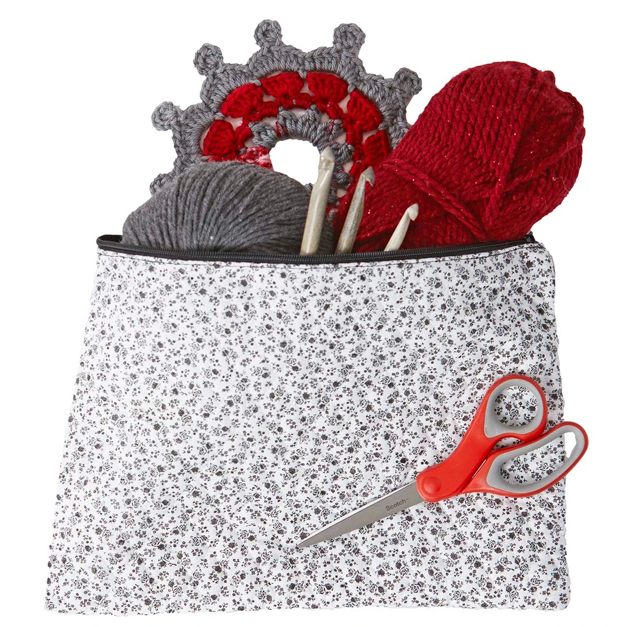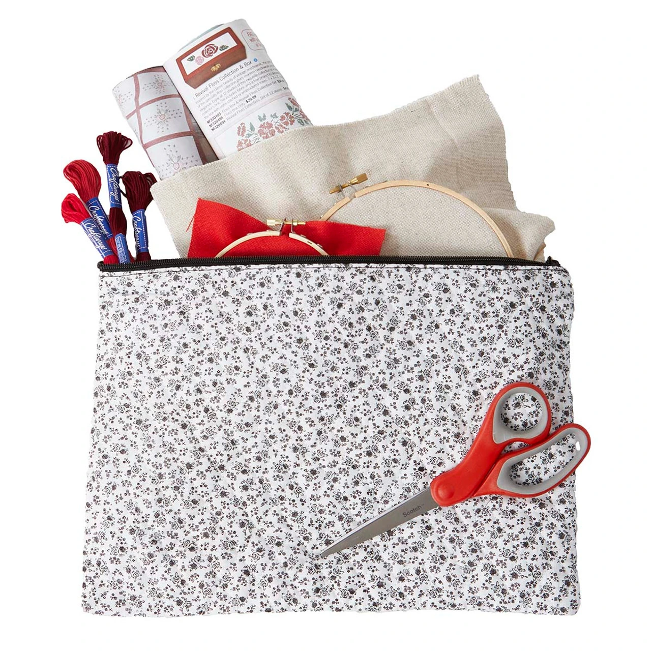 This catch-all bag is perfect for carrying notions, tools, accessories, and small projects. Toss in your supplies for stitching on the go or tuck your accessories away for a quick clean-up in your home stitching space. Sewn from vintage-inspired quilted fabric and a zipper closure, this large and spacious 14 x 10″ (36 x 25cm) zippered bag is perfect for stitchers, knitters, crocheters, and crafters, looking for a place to tuck scissors, stitch markers, pins, floss, measuring tapes, and more. The bag will keep your tools and accessories contained and organized in your project bag at home or on the go. Imported.
