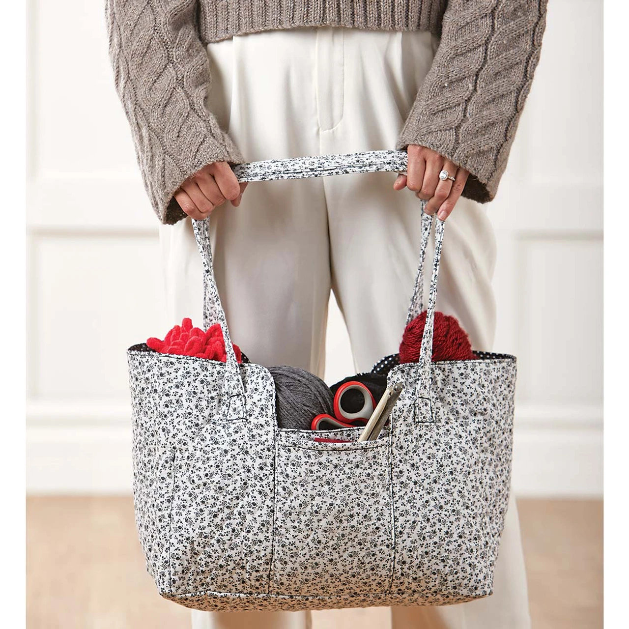 This project tote is perfectly sized for smaller projects. With a convenient carrying size of 14 x 6 x 10″ (36 x 15.2 x 25cm), this underarm shoulder tote slips easily over your shoulder to take your project on the go. The spacious interior of the bag will hold your project, yarn, patterns, and other stitching essentials. An outer pocket will hold scissors, hooks, tools, accessories, and other notions. Sewn from vintage-inspired quilted fabric. Contents not included. Imported.