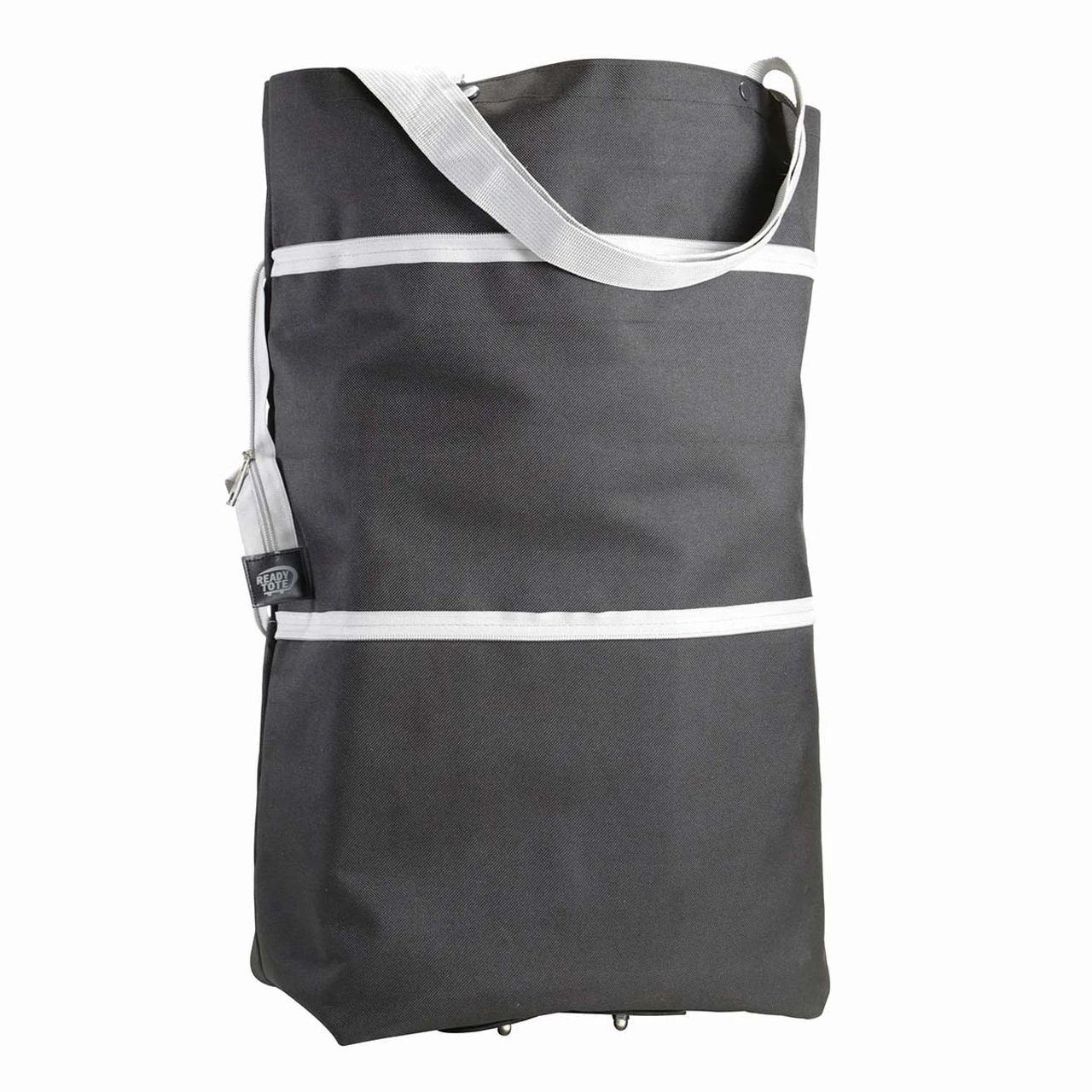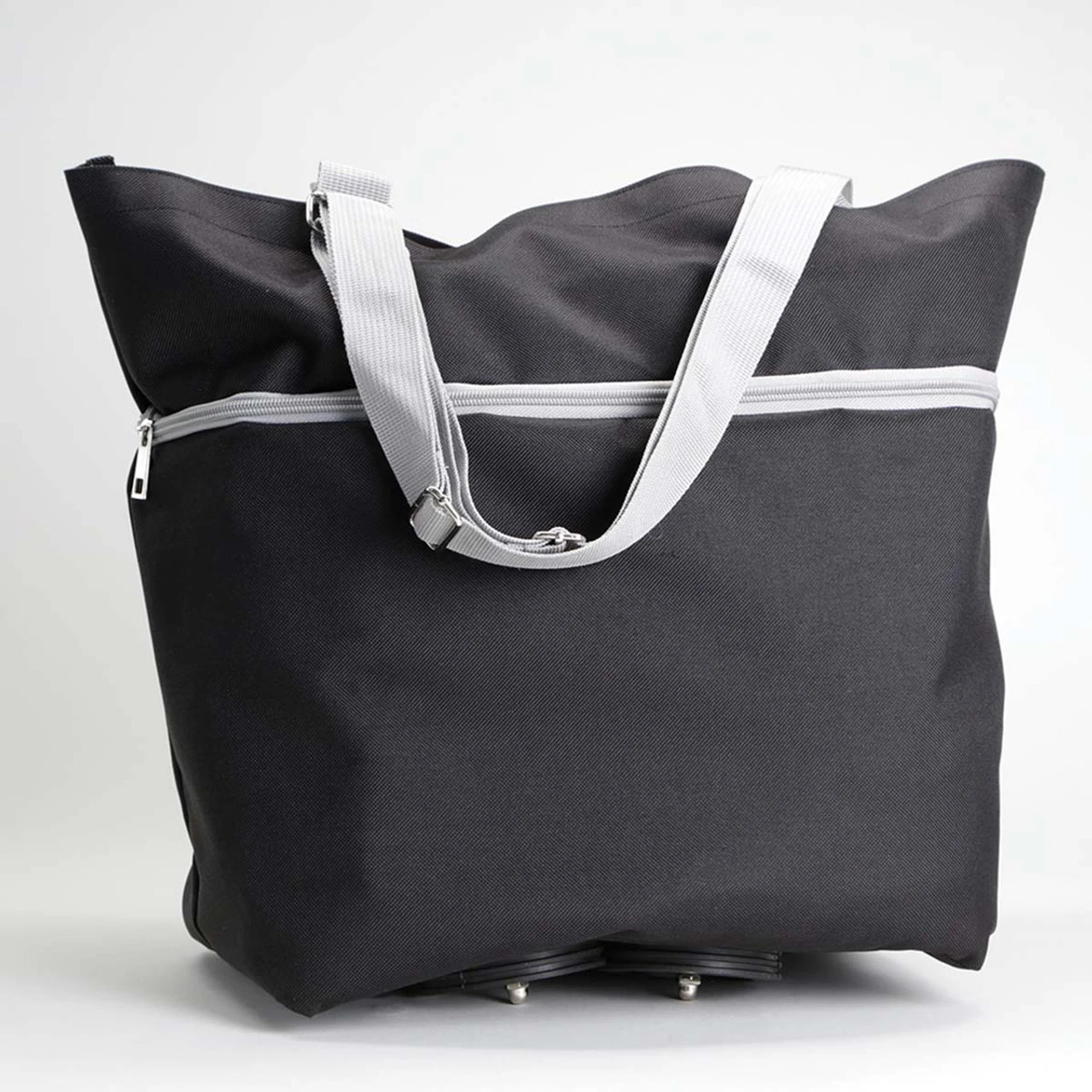 β’ This expandable tote converts from a shoulder tote to a rolling tote.